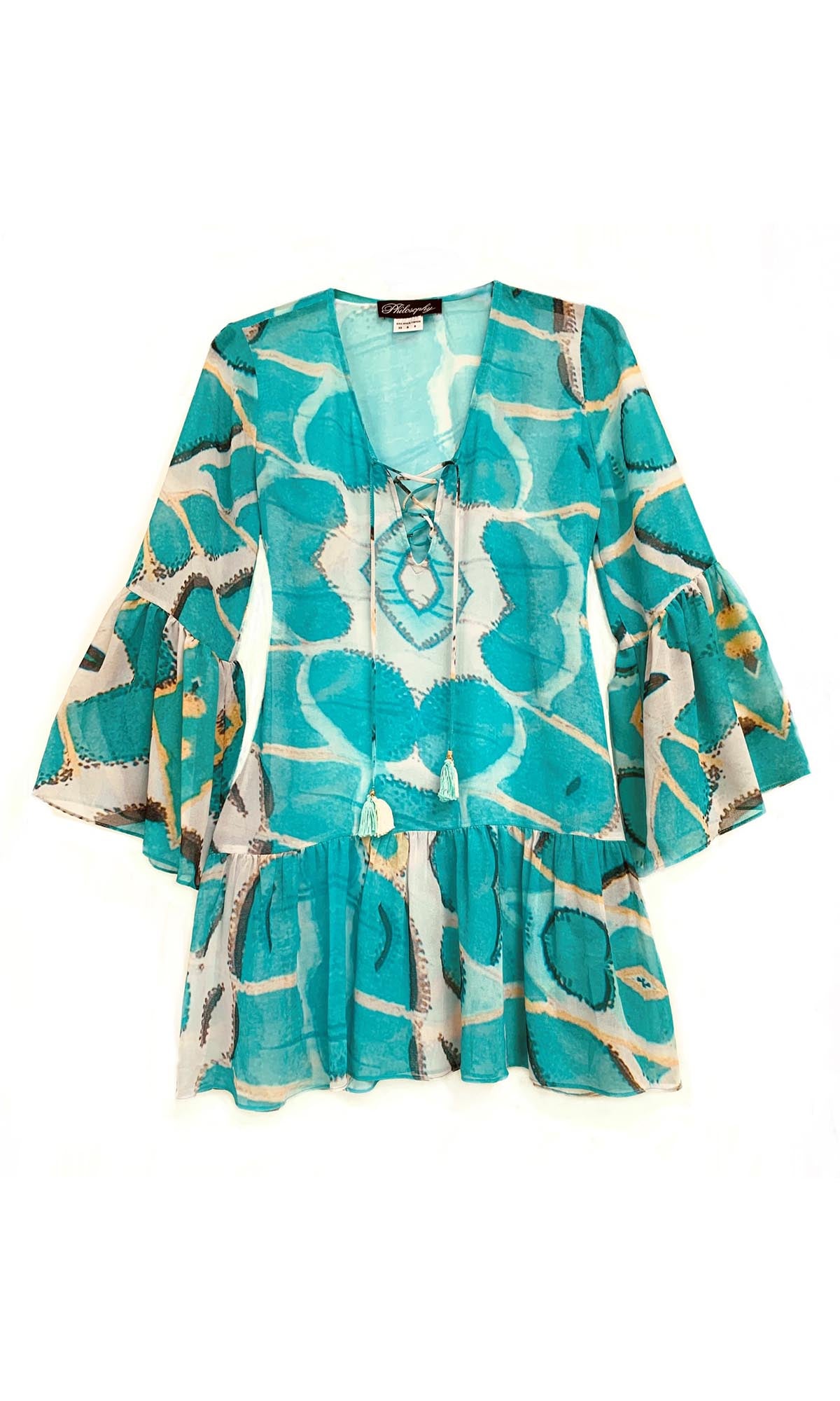 Made in Pebble chiffon, loose cut boho for movement with generous frill at the hem and the sleeves.